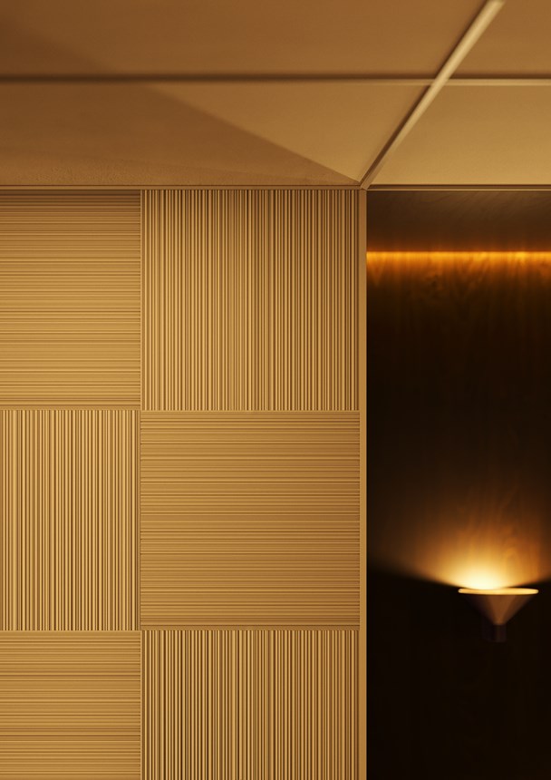 Створена бельгійським дизайнером продуктів Бертраном Лежолі, настінна панель ALLEGRETTINO базується на виразній мові дизайну ALLEGRETTO з більш частим повторенням його лінійного, асиметричного мотиву. Це створює делікатний і витончений дизайн поверхні, ідеальний для створення вишуканих, сучасних інтер'єрів. Візерунок, натхненний мінералами, підкреслює гру світла і тіні, додаючи унікальну архітектурну текстуру стінам, стелям або меблям. ALLEGRETTINO також має на зворотному боці насічки для різання, що дозволяє