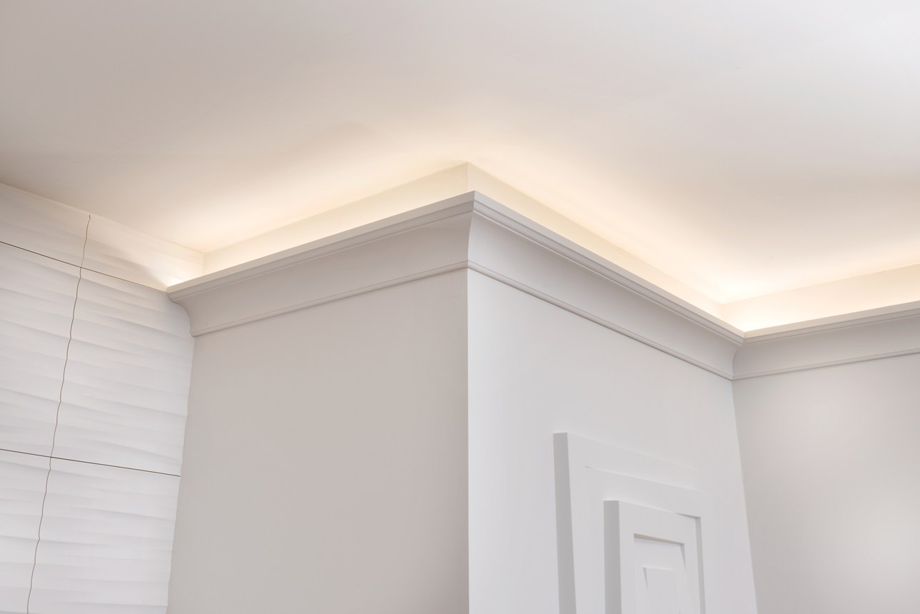 Карнизи, стінові молдінги та елементи, підлогові плінтуси, що поєднуються з прямим або прихованим освітленням - створені